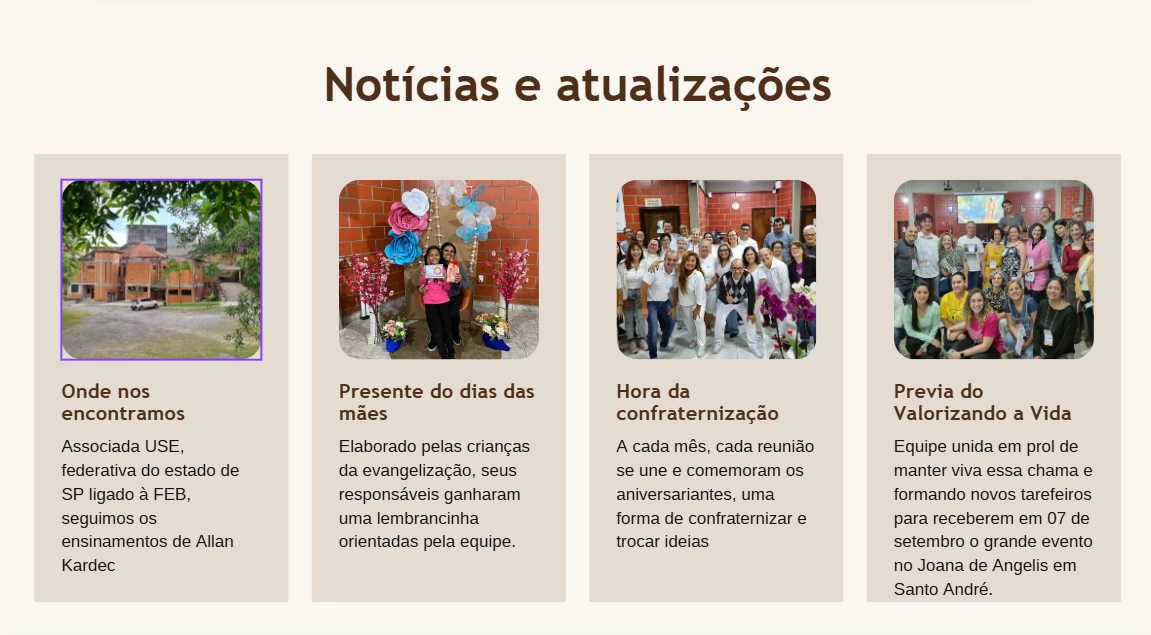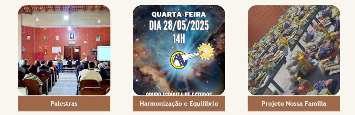 Trabalhamos com evangelização infantil, mocidade e adultos, atendimento espiritual, reuniões de estudos, reuniões de harmonização e equilíbrio, palestras com temas relacionados a Doutrina Espírita, trabalho social no Projeto Nossa Família, Bazar Desapega e Eventos como Noite da Pizza entre outros.